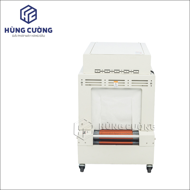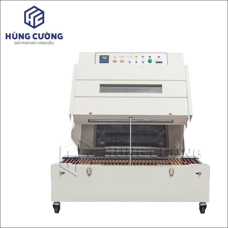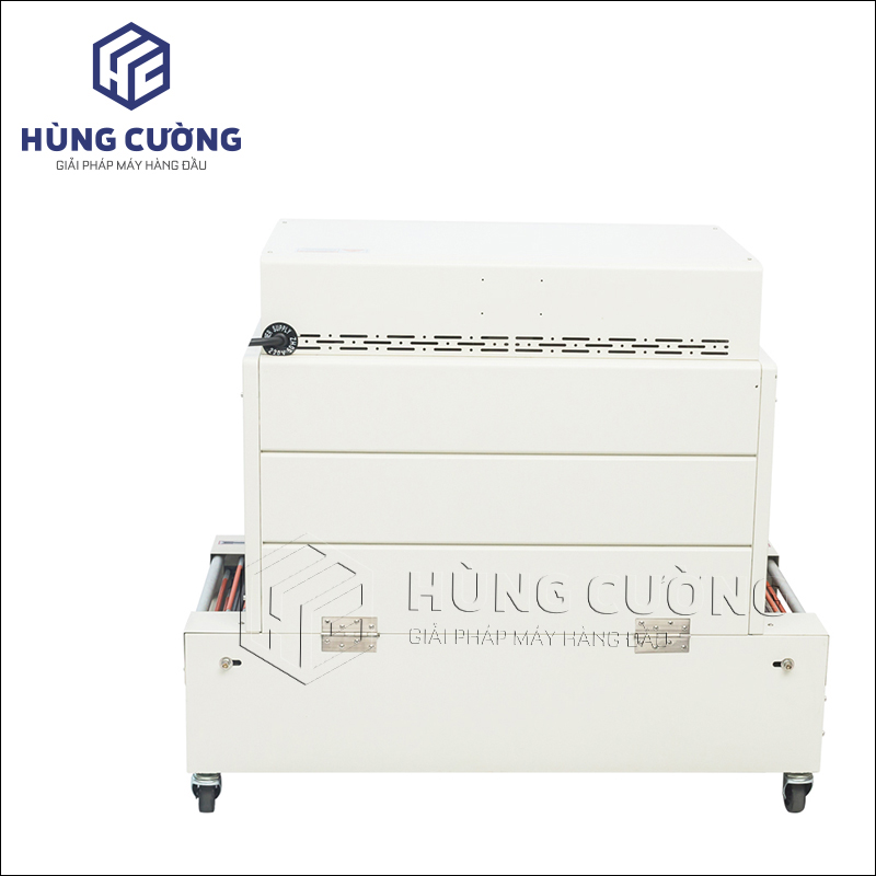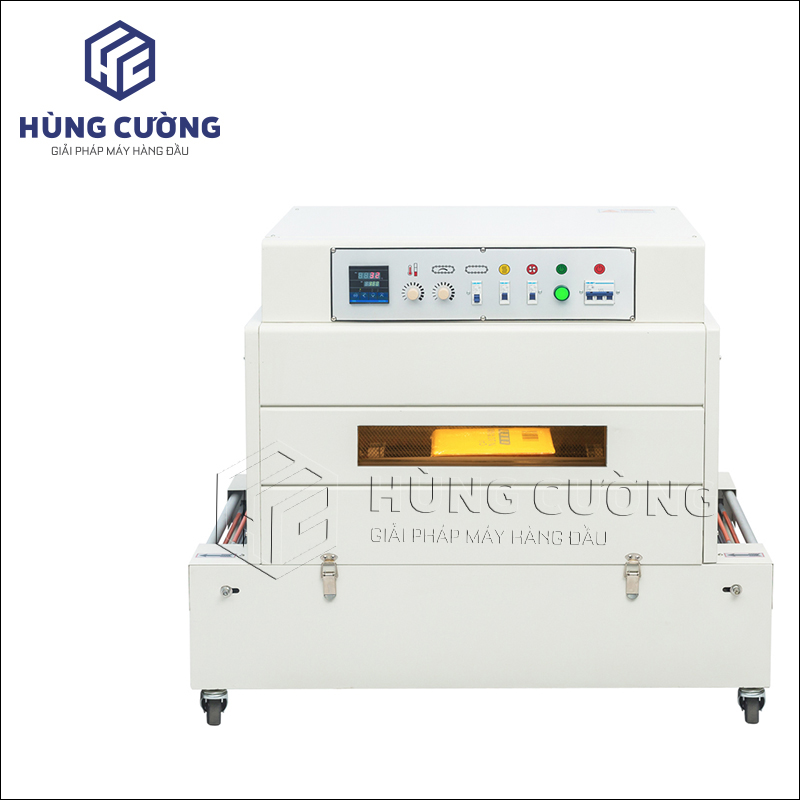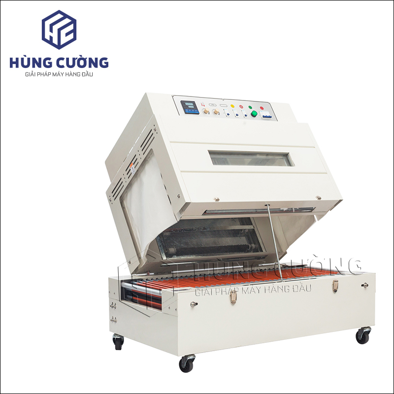 Buồng co nhiệt thiết kế có kích thước buồng 400 x 350 mm, rộng rãi để đóng gói các sản phẩm có kích thước nhỏ, kích thước vừa, máy có cửa sổ nhỏ bằng kính chịu nhiệt và bóng đèn chiếu sáng tạo điều kiện quan sát sản phẩm bên trong buồng co. Thân máy dễ dàng nâng lên bởi thiết kế đặc biệt, chỉ cần 1 thanh chống để nâng đỡ là dễ dàng thay thế linh kiện, vệ sinh máy.