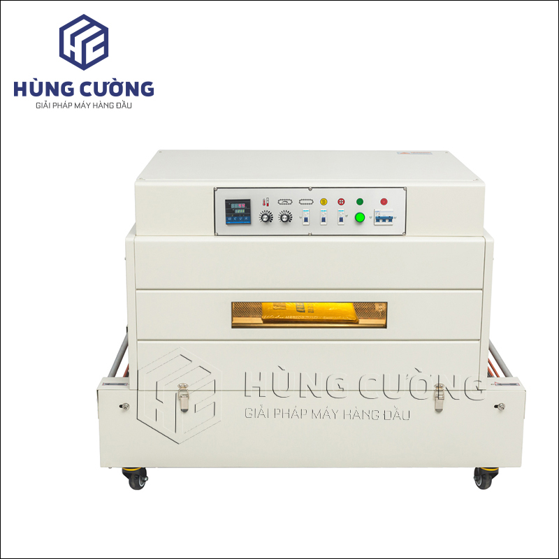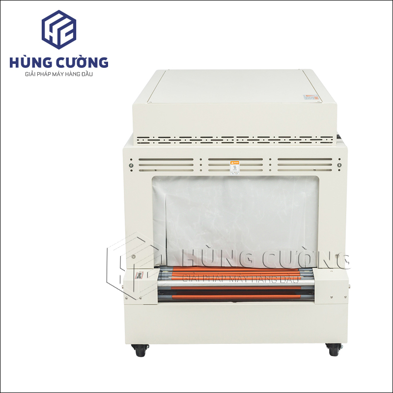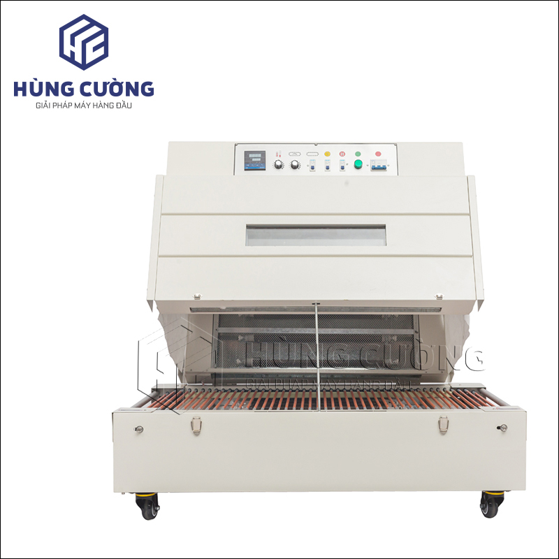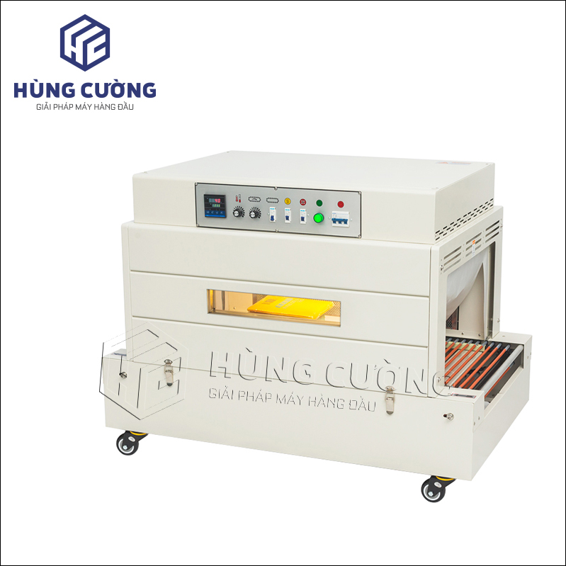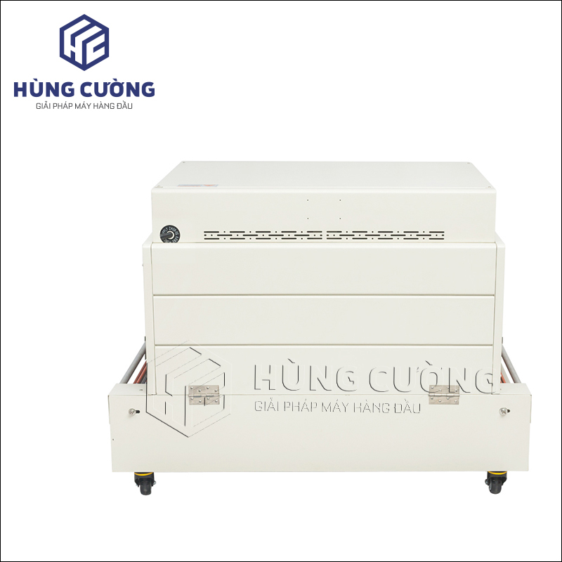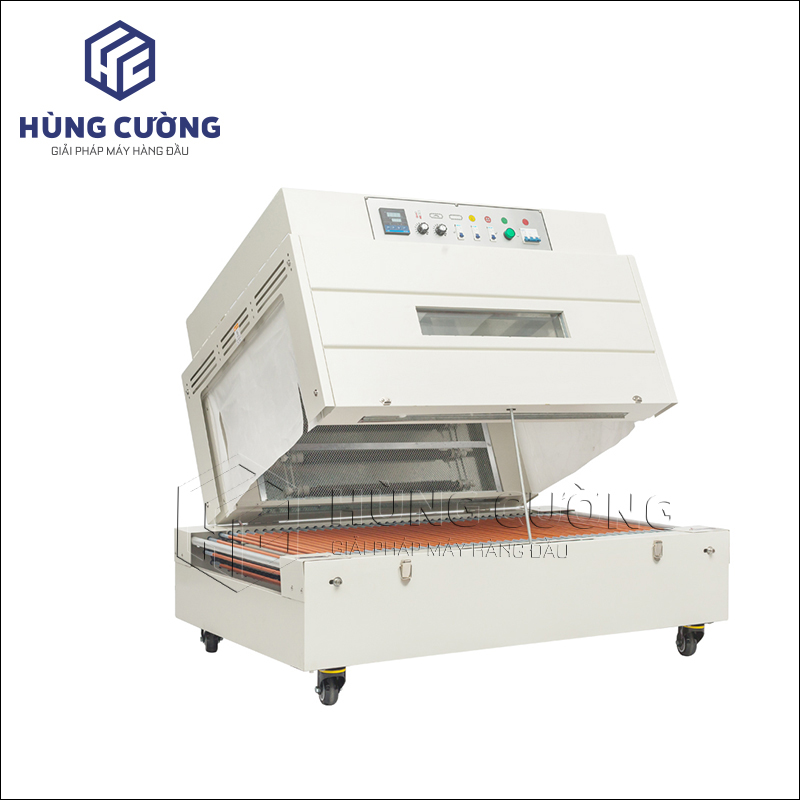 Buồng co nhiệt thiết kế có kích thước buồng 600 x 350 mm, rộng rãi để đóng gói các sản phẩm có kích thước lớn, máy có cửa sổ nhỏ bằng kính chịu nhiệt và bóng đèn chiếu sáng tạo điều kiện quan sát sản phẩm bên trong buồng co. Thân máy dễ dàng nâng lên bởi thiết kế đặc biệt, chỉ cần 1 thanh chống để nâng đỡ là dễ dàng thay thế linh kiện, vệ sinh máy.