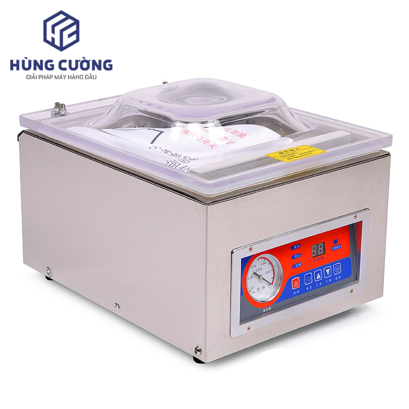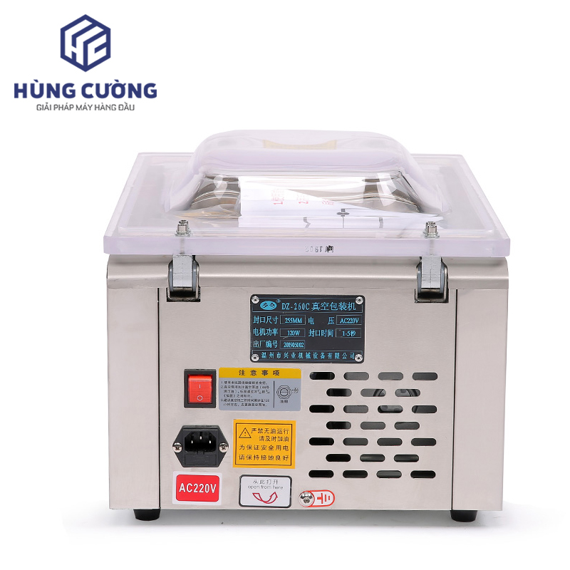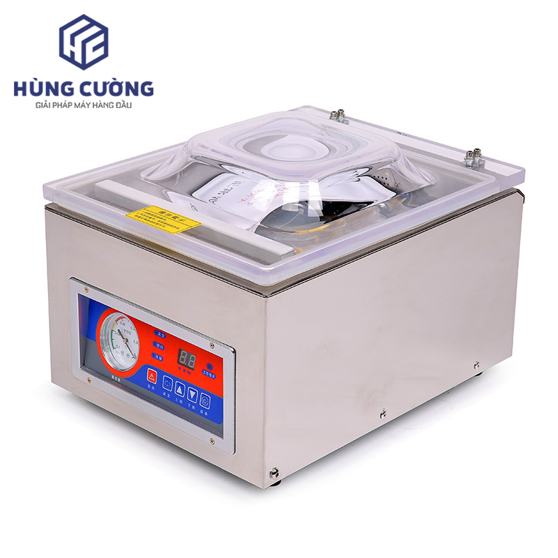 Máy có cấu trúc nhỏ gọn, thân vỏ máy sử dụng vật liệu inox 304 SUS cao cấp nhất, đảm bảo độ bền, an toàn vệ sinh thực phẩm, nắp máy sử dụng vật liệu mica trong suốt, dễ dàng quan sát quá trình hút chân không bên trong.