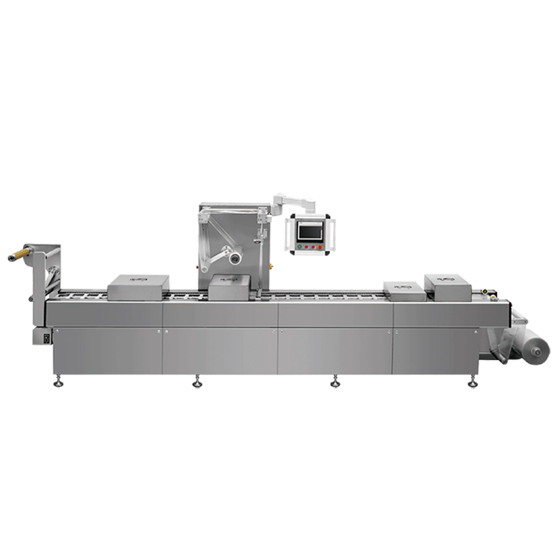 Máy đóng gói hút chân không nhiệt định hình xúc xích DLZ-520 T sử dụng màng nhiệt bao bì chuyên dụng để đóng gói, tạo hình sản phẩm. Máy sử dụng 2 cuộn màng, cuộn màng dưới dùng để tạo hình sản phẩm thành dạng khay hoặc các hình thù đặc biệt khác theo yêu cầu, cuộn màng bên trên dùng để niêm phong phần miệng khay thực phẩm. Sản phẩm được sử dụng phổ biến trong công đoạn đóng gói xúc xích, thịt cá đông lạnh, trái cây và nhiều loại thực phẩm khác.