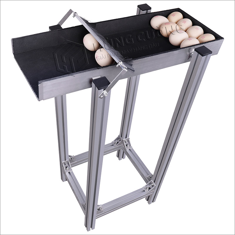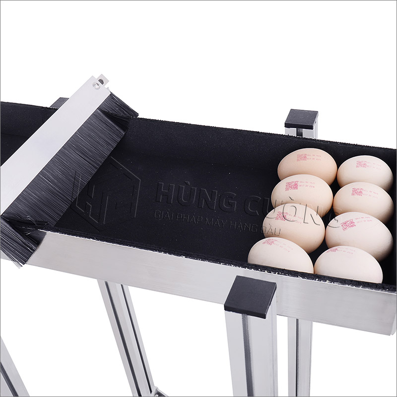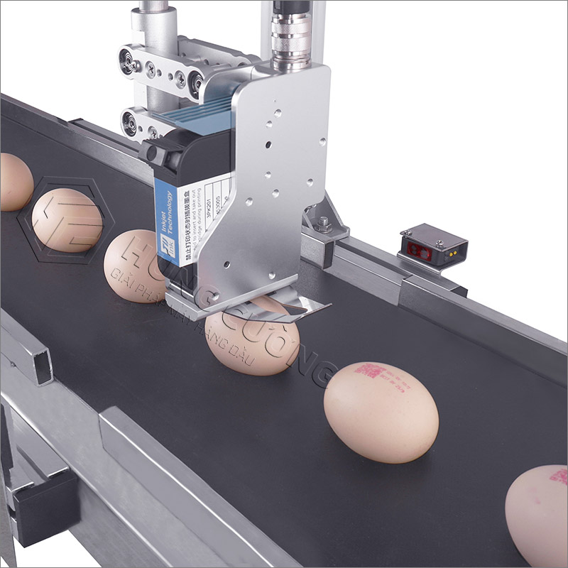 Máy kết hợp băng tải chuyên dụng để vận chuyển trứng đi in, trứng được dữ trữ trong các lỗ trong thiết kế vào băng tải giúp dễ dàng cố định từng quả trứng lên lỗ. Trứng được chuyển tiếp trên băng chuyền với tốc độ đã định, khi cảm biến phát hiện tín hiệu trứng, thông tin liên quan sẽ được in lên bề mặt quả trứng.